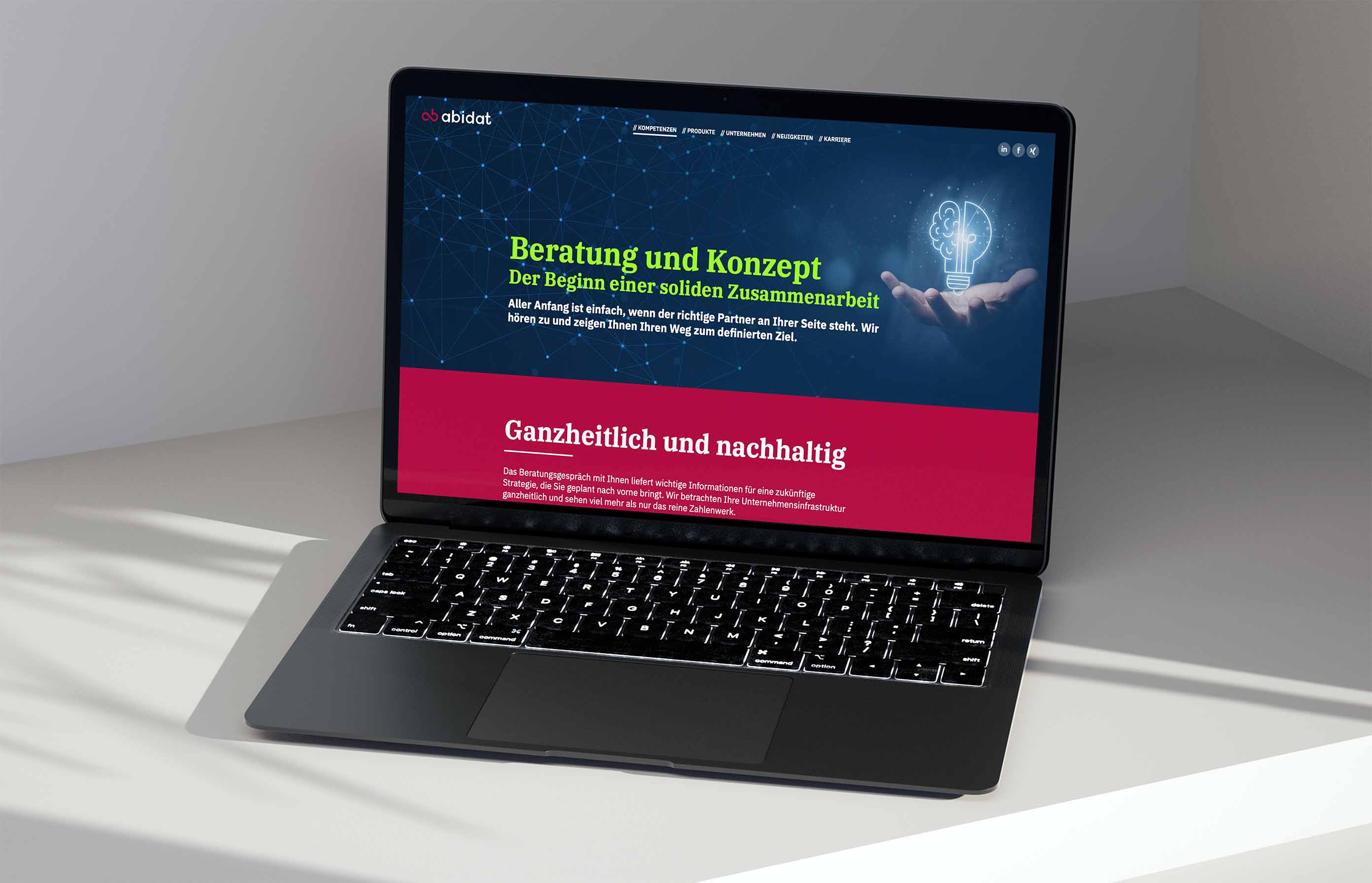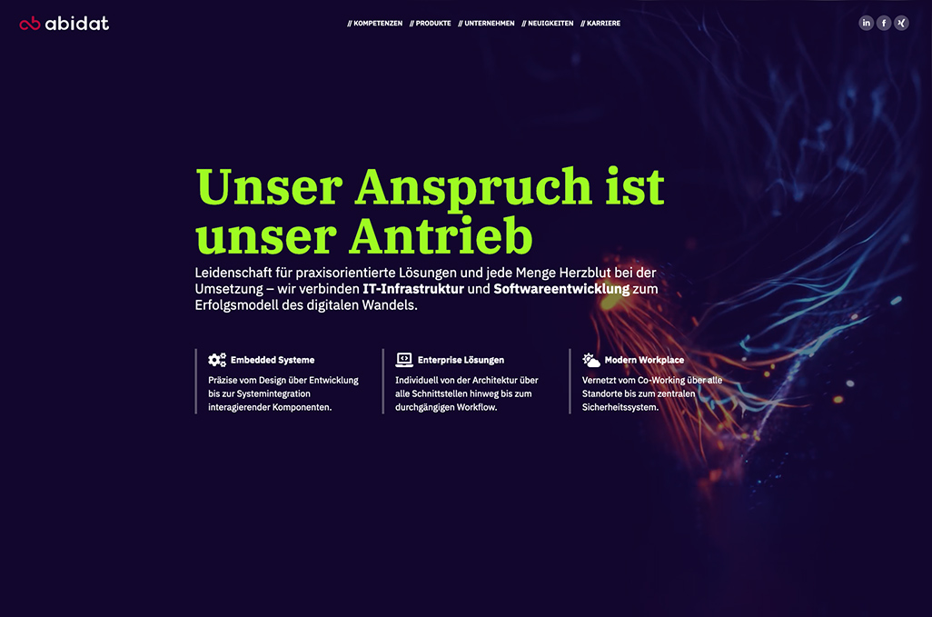 Branche Kunde Leistung Als Hausagentur unseres Schwesterunternehmens ABIDAT war es uns ein besonderes Vergnügen, den Webauftritt von der ersten Idee bis zum letzten Punkt umzusetzen. Unter dem Motto, „du tust Gutes, lass es andere wissen“, war die große Herausforderungen, das umfangreiche Leistungsangebot strukturiert und übersichtlich darzustellen.